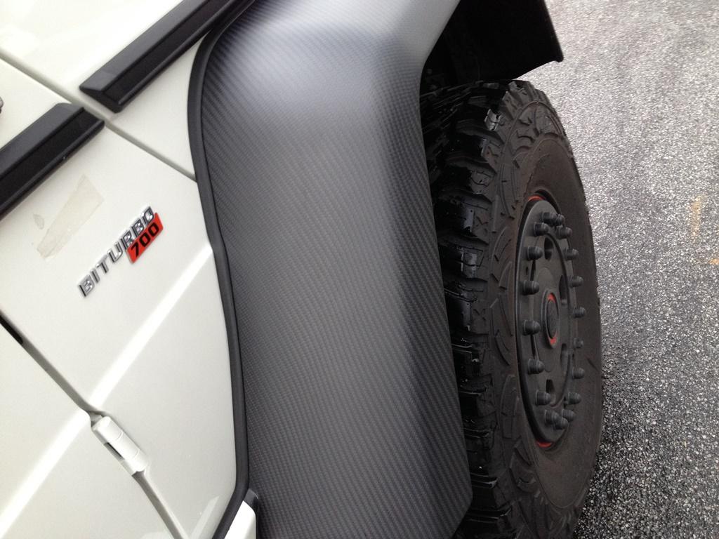 The innovative Brabus lighting concept sets further visual signals. It includes dark-tinted LED lights integrated into the front spoiler edges. Even more dominant are the black Brabus xenon headlights and daytime running lights with integrated turn-signal function for all current models of the venerable off-roader. The now obsolete production turn signals on top of the fenders are replaced with clear-coated matt carbon-fiber covers. In conjunction with the matt carbon-fiber structure on the hood and the carbon-fiber shells for the exterior mirrors they round out the belligerent 6×6 look to full effect.
