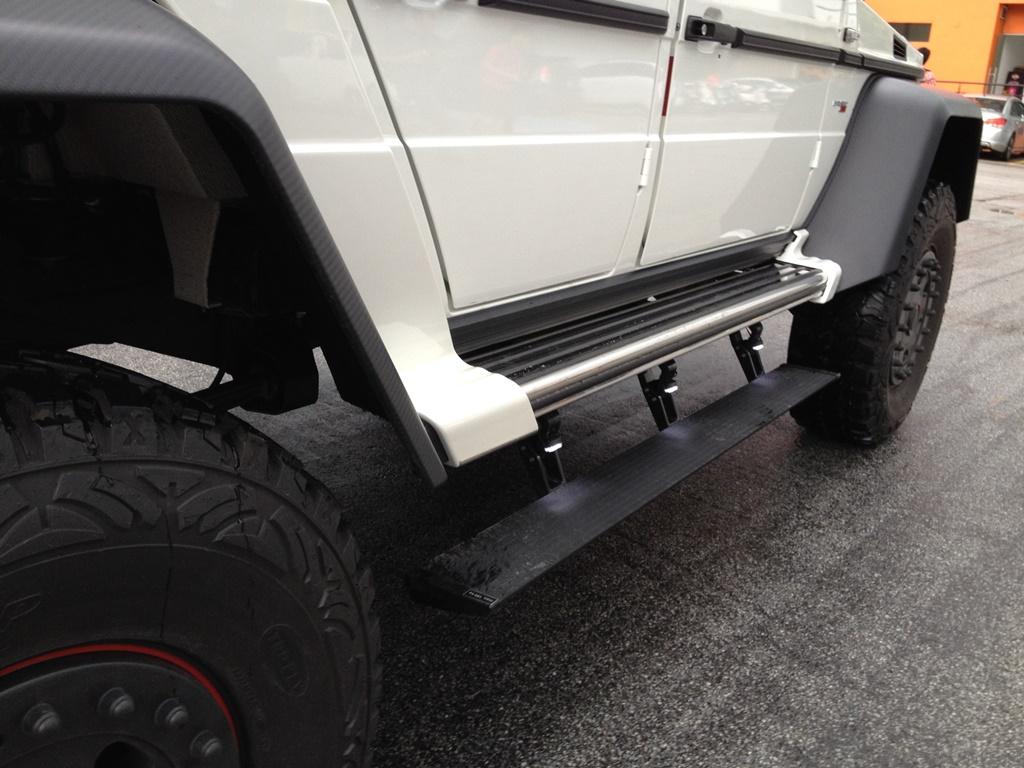 Brabus also gives the 6×6 a strategic visual upgrade. The imposing nature of the front is further strengthened by purposeful modifications. The Brabus front spoiler edges attach to the production fascia and are combined with an additional molding below the special radiator grille with integrated Brabus logo. The Brabus carbon-fiber hood scoop adds another striking highlight. The mirror-polished Brabus underride guard provides an interesting contrast to the all-black paintwork.