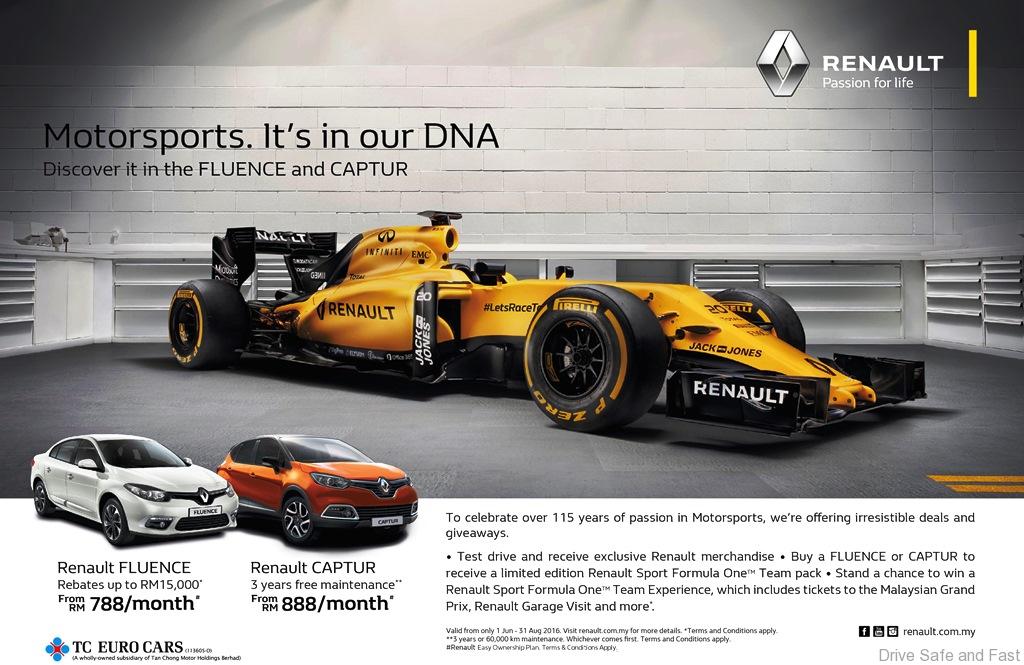 Valid until 31 August 2016, this new promotional campaign offers attractive deals on selected Renault vehicles as well as the chance to win exclusive Renault Sport Formula One™ Team prizes including Grandstand passes and a Renault Garage Visit at the 2016 Malaysian Grand Prix.