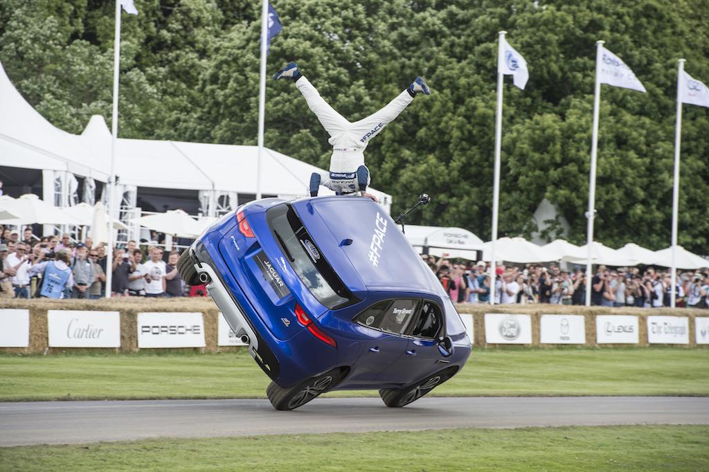 This time, Grant piloted Jaguar’s first family sports car up the famous Goodwood hill on two wheels. As if that was not enough, professional freestyle motorbike stunt rider Lee Bowers was on board to add even more jeopardy to proceedings. Bowers is no stranger to two wheels and swapped his saddle for the luxurious leather interior of Jaguar’s first performance crossover. As the F-PACE two-wheeled up the demanding course, Bowers climbed out of the passenger window to stand on the side of the Jaguar and salute the crowd, before climbing back inside ahead of the finishing line.