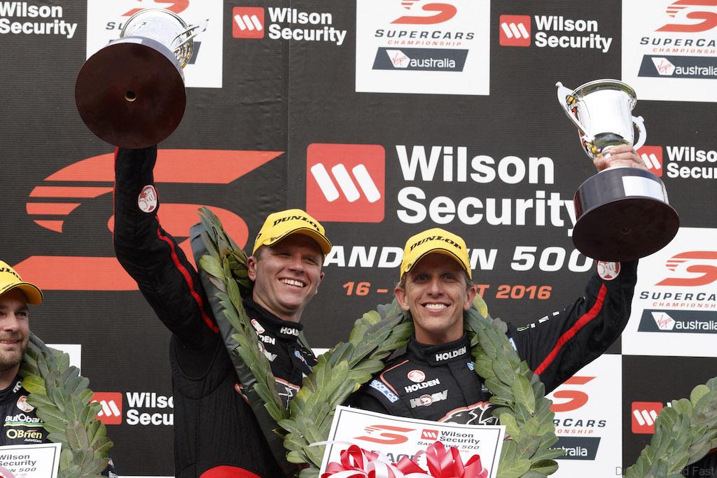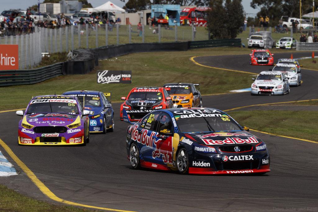 Holden’s Tander’s victory looked in doubt when the front left guard on his car came lose after it appeared to be struck by a piece of rubber as he raced down the straight on lap 122, but he was able to nurse the damaged car home for the rest of the race with the Red Bull car in hot pursuit.