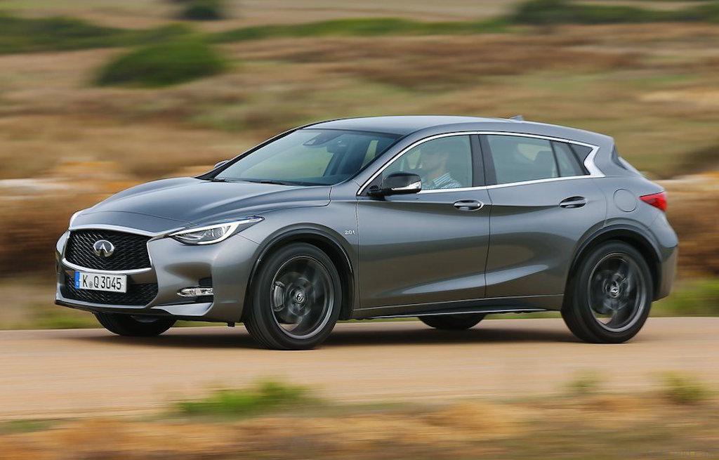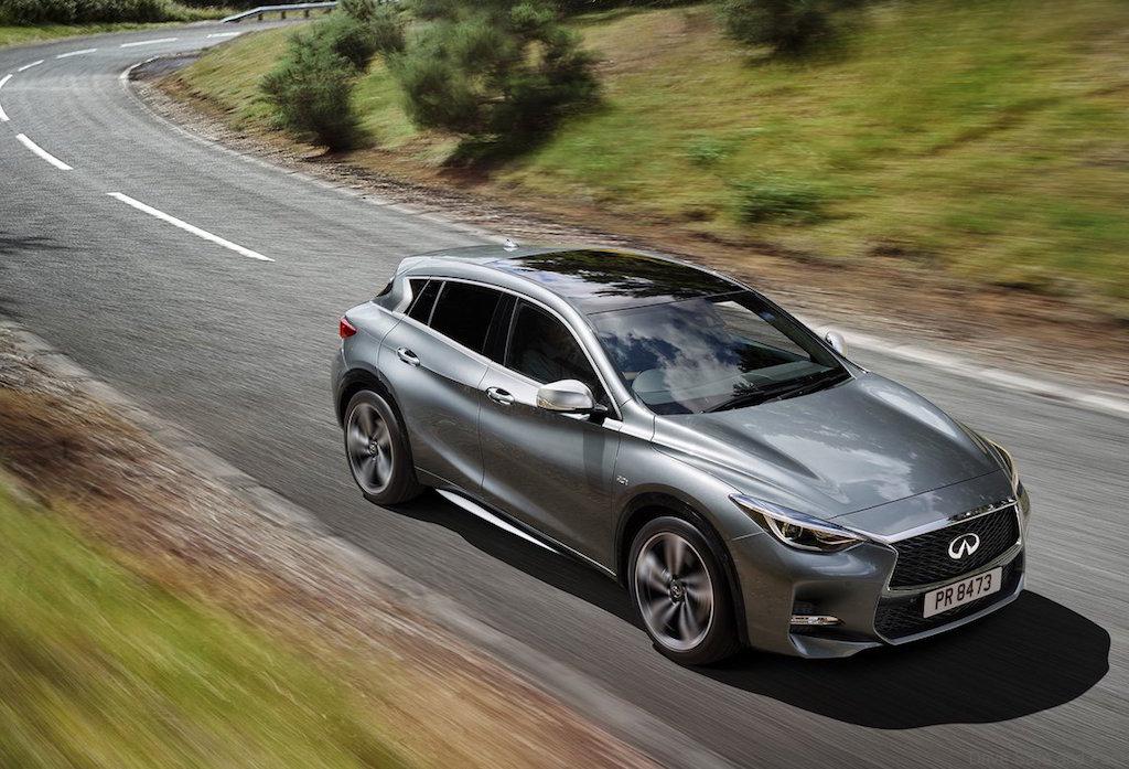 The Infiniti QX30 Sport includes unique front and rear lower fascias, gloss black grille, body-color side sill panels, chrome trunk finisher, dark chrome exhaust finishers, a lower ride height, sport suspension tuning, cross drilled front brake rotors and unique 19-inch aluminium-alloy wheels.
