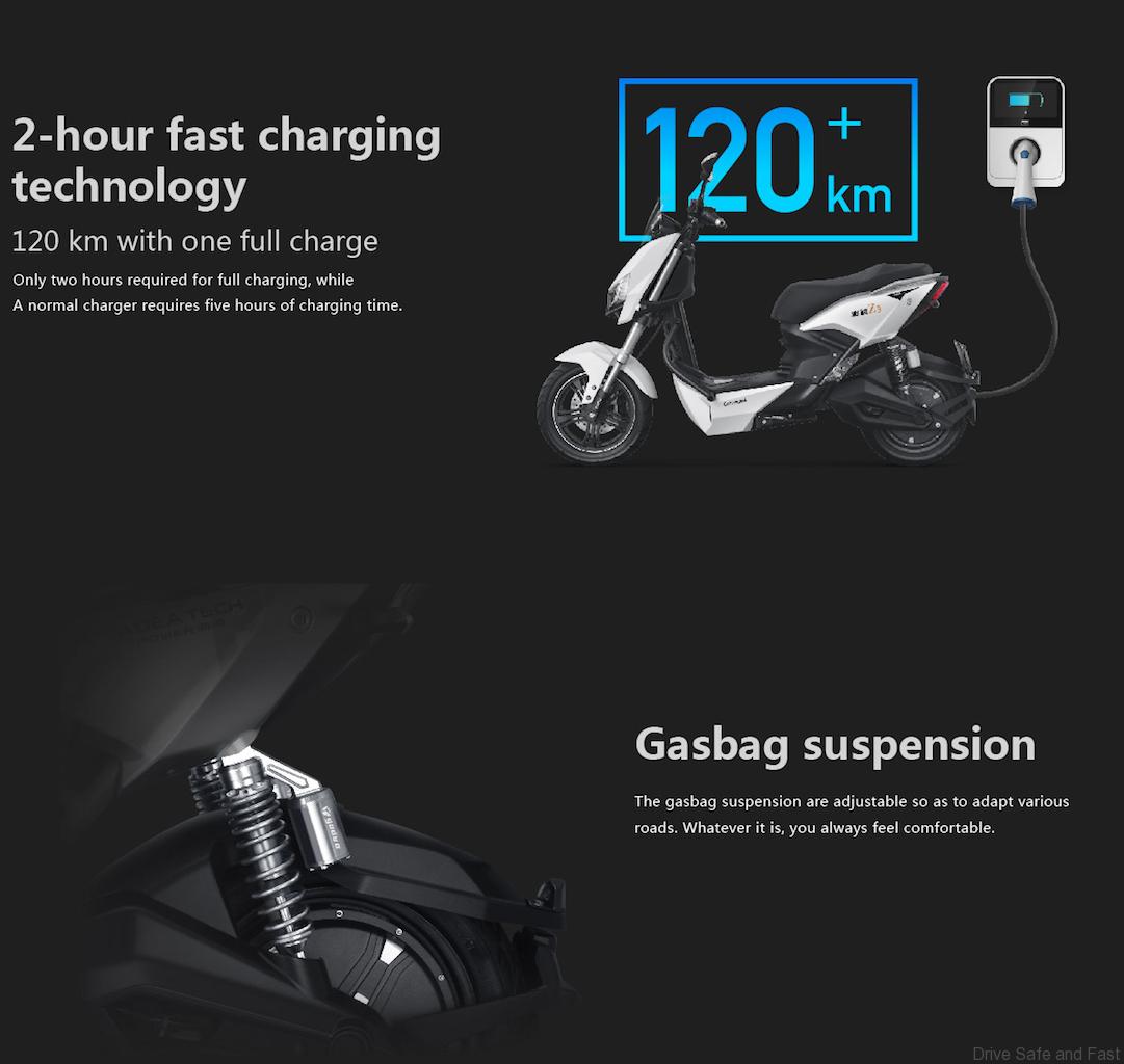 Apart from improved motorcycle ergonomics design, Z3 also adopts a sophisticated carbon alloy frame and a powerful inverted damping system with a vibration test running for 4 million times. Equipped with rear air shock absorbers (suspension), military-grade run-flat tires and automotive paint technology, Z3 is aiming for a true racing motorcycle experience. Yadea Z3 passed over 200 strict national tests and 120 days of closed tests which totaled 100,000 km (62,500 miles) driving distance.