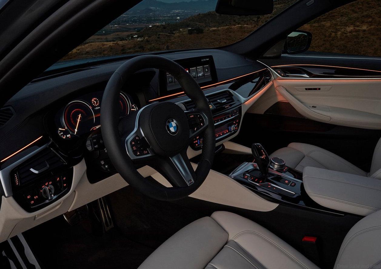 The M Sport package will be available from launch for the new BMW 5-Series. It includes the M aerodynamic package (front apron with larger air intakes, side skirt trim, a diffusor-style rear apron and an exhaust system with two rectangular tailpipes), lowered M Sport suspension and M light-alloy wheels in 18-inch (optional 19-inch) format. Inside the car, M sports seats with Alcantara covers highlight its sporting focus and are joined by the new M Sport leather steering wheel, exclusive floor mats, interior trim strips and aluminium pedals.