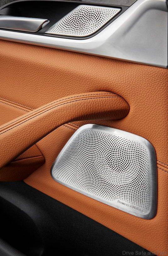 A surround sound system from Bowers & Wilkins with diamond tweeters is available for the first time in the new BMW 5-Series range. This optional high-end audio system is renowned for delivering the ultimate in listening pleasure. The 10-channel amplifier feeds a total of 16 speakers with brushed stainless steel grilles sporting the exclusive Fibonacci-patterned holes, which illuminate when the system is switched on. Total output is an impressive 1,400 watts. A measuring microphone is built into the car to allow the acoustics to be precision tuned to the specific conditions – for example, the number of occupants – in order to create a flawless surround sound experience for everyone in the car. What’s more, the sound setting can be matched to the selected music genre.