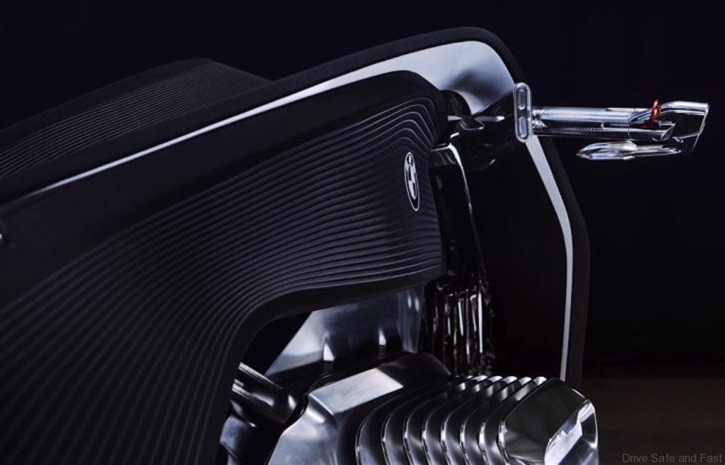 In the middle of the triangle frame sits a style feature and historical reminder: the power unit. Designed and created in the image of the traditional BMW boxer engine, it actually consists of a zero-emissions drive unit. Its outward appearance changes depending on the circumstances: when the bike is resting, the power unit is compact, extending outwards only when the bike sets off, to enhance aerodynamics and protect the rider from the elements. Its polished aluminium finish confirms the superior quality of this component.