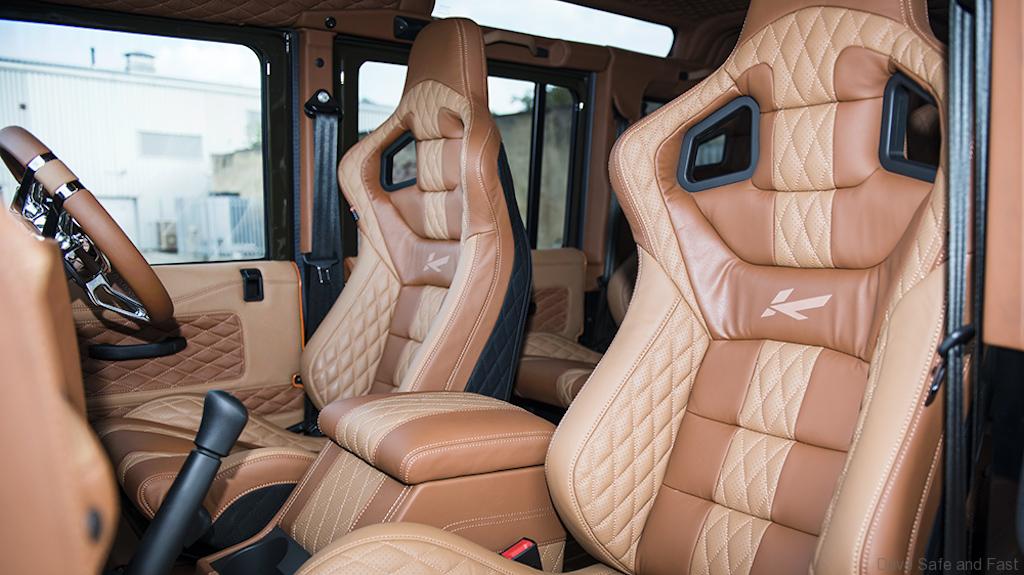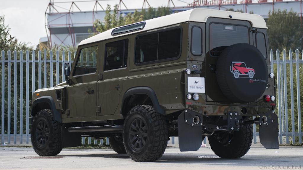 The best of both worlds starts with the Chelsea Truck Company Wide Track exterior kit. Both the front and rear wheel arches extend outwards for a brawnier, tougher look. The front fascia sports a new X-Land front grille in matching Fungus Green and Old England White, just like the exterior color and roof combo. A new front bumper incorporates new lighting elements, cross-hair military headlights, and a sump guard, while mesh hood vents keep the engine bay cool. At the rear sits a large Chelsea Truck Company spare wheel cover to make its new styling even more apparent.