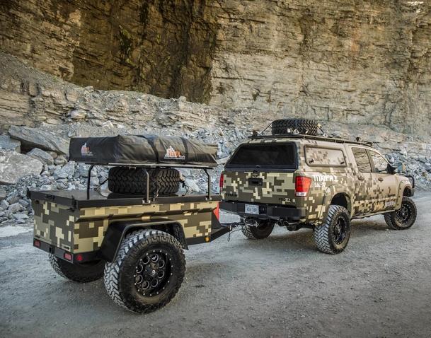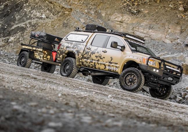 Inside, a streamlined interior gives the truck a more customized feel, while a freshened shifter and steering wheel lead to a more comfortable drive. New, rugged Katzkin leather-wrapped seats feature Project Titan and Wounded Warrior Project embroidery. Coordinated tan stitching is found on the seats, steering wheel and door panels. Adding utility to the experience, Project Titan tows a matching customized all-terrain camping trailer featuring a camp-style kitchen, tent, water/fuel storage and a spare tire.