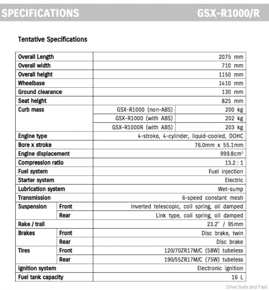 – Vehicle weight: 200kg/202kg (ABS variant)/203kg (GSX-R1000R)