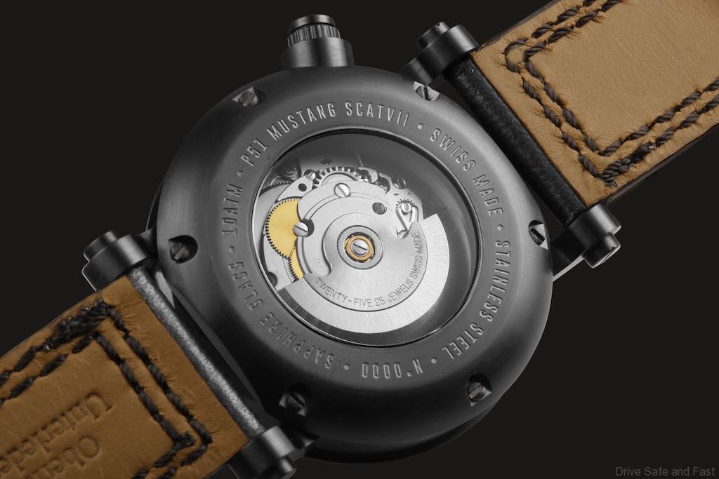 Dressed in a solid stainless steel case, the “P-51 Mustang” timepiece boasts a beautifully finished exterior. Top and bottom parts of the case are polished and the middle part is horizontally brushed. Its case measures 44mm diameter and thickness is 14mm. Top and bottom of the watch case is secured with scratch resistant sapphire crystal glass. Positioned at 2’o clock, the screw down crown ensures water resistance of 10 ATM.