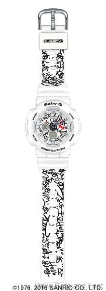 The dial and band are patterned with graffiti Baby-G and Hello Kitty tags, and the character’s distinctive ribbon is printed on the dial. The hour and minute hands feature red highlights that are the same color as the ribbon, further enhancing the Hello Kitty theme.