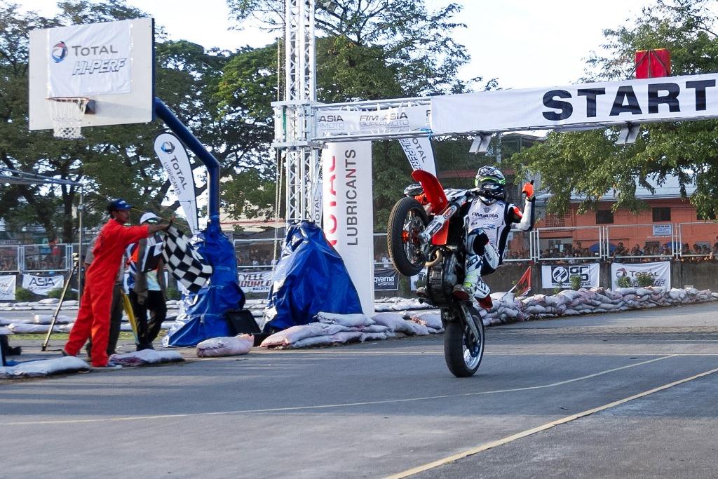 The venue was the prided recreational sport of Angeles City – Bayanihan Park. The track was rather unorthodox as the “tarmac” section was converted from the park’s basketball and tennis courts while a slippery field of uncut grass played the role of the ‘dirt’ section. The very narrow track was interspersed with sharp corners and grassy dividers. All of this daunted the riders with a very challenging race ahead but they weren’t Asia’s best Supermoto racers without reason, and they took the challenge head on. Hordes of Supermoto fans and curious onlookers flocked in over the weekend to witness the high-paced spectacle.