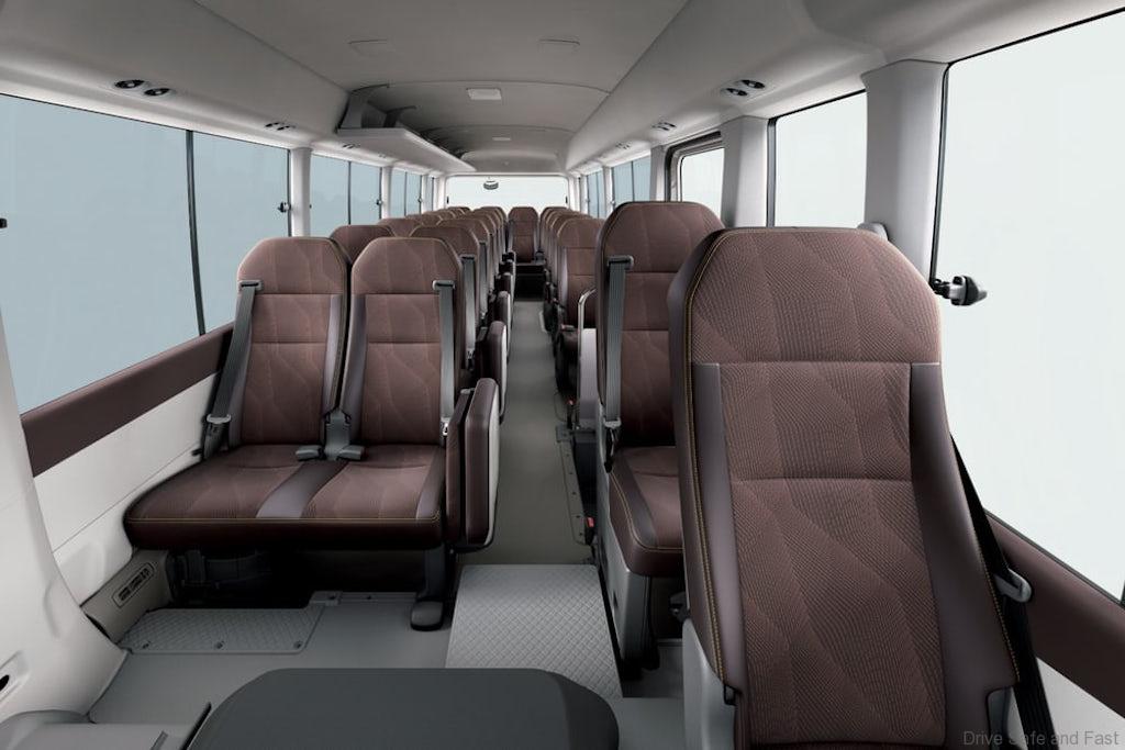 All those passengers get to enjoy a roof that’s 60 mm (2.36 in) taller, a body that’s 40 mm (1.57 in) wider and side windows that are 50 mm (1.97 in) higher than before. UV glass will keep the cabin cooler, and the leather/fabric seats with low-rebound cushions have been designed for extra long-range comfort.