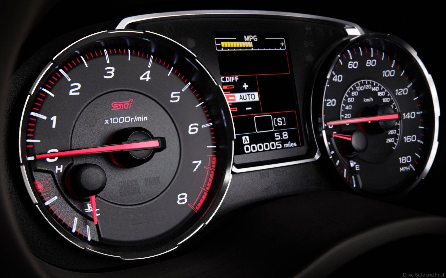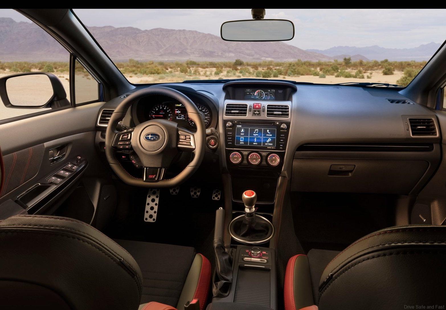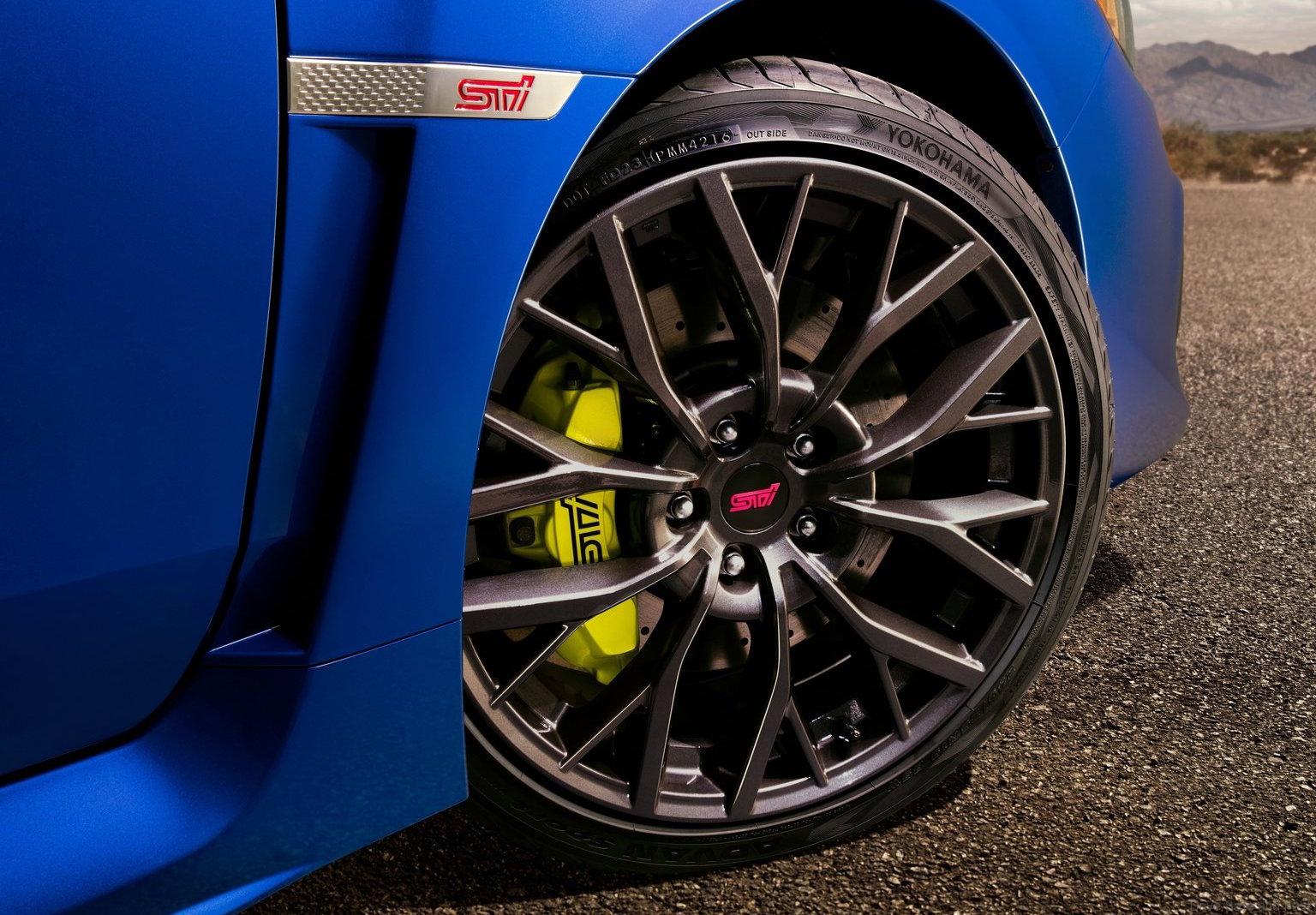The yellow-painted brake calipers identify a significantly upgraded Brembo Performance Brake System that now uses stronger monoblock 6-piston calipers in front, monoblock 2-piston calipers in the rear and larger, drilled rotors all around for better heat dissipation. New brake pads provide significantly greater surface area for improved braking feel and fade resistance. The STI also offers the Recaro seats (standard on STI Limited, optional for base trim).