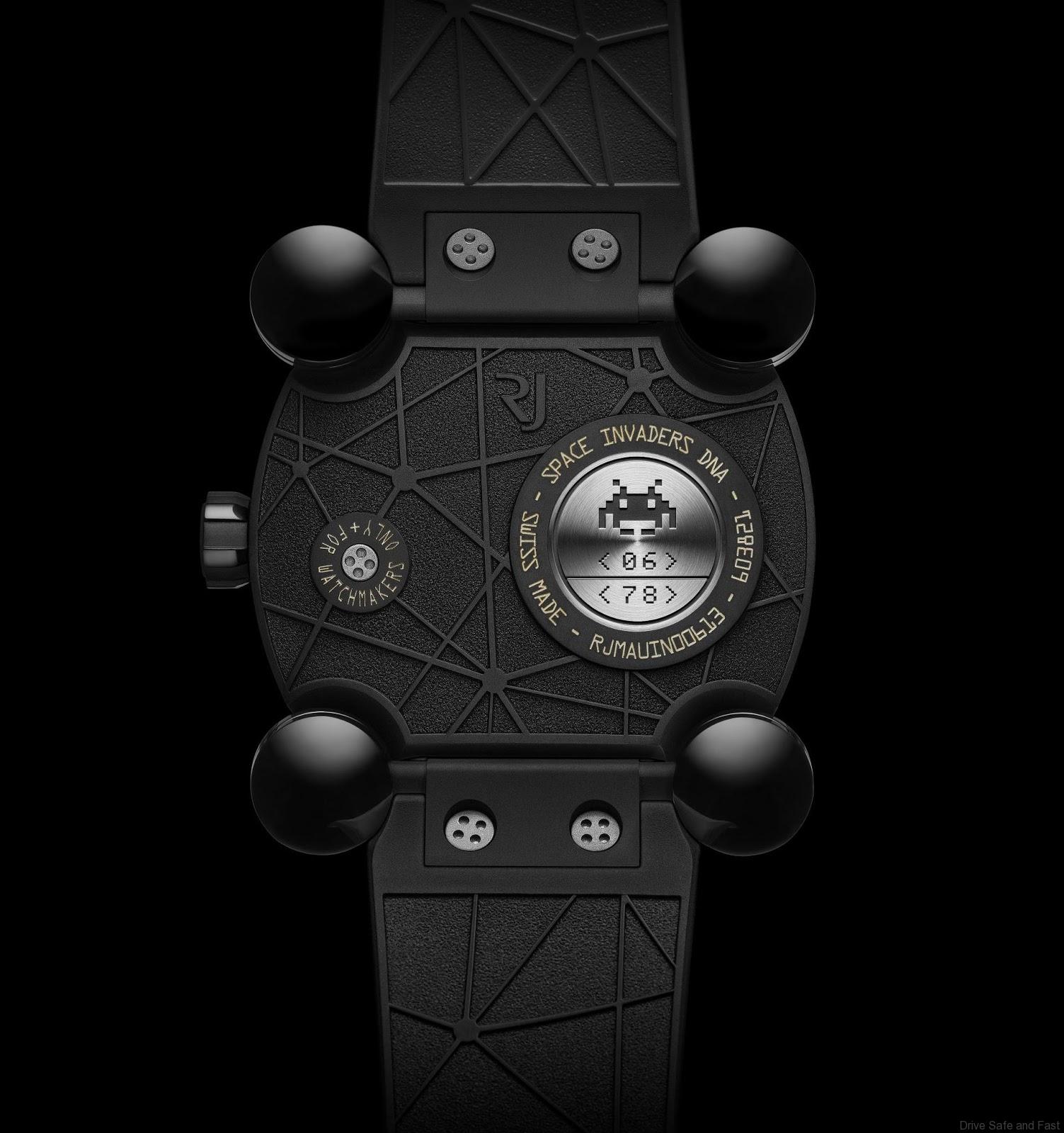 Case back: Grainy-textured stellar-patterned with Space Invaders TM medallion; RJ safety screw on the case-back, exclusively accessible to watchmakers