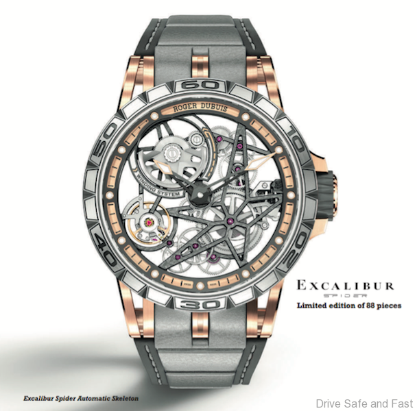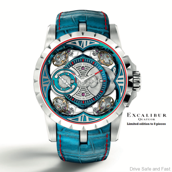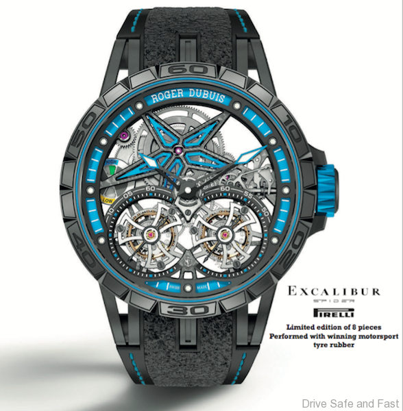 Roger Dubuis has announced its newest watch and it’s a partnership with racing tire maker Pirelli. The two brands have teamed up to create the new and blue Excalibur Spider Pirelli with double flying tourbillon in a limited series of just eight pieces.