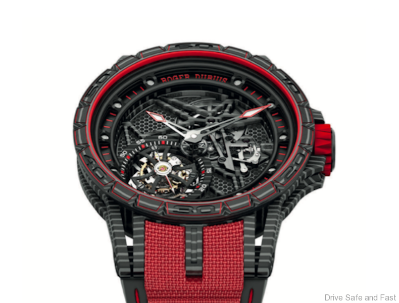 Roger Dubuis for this particular limited edition watch have created straps with inlays made of rubber from Pirelli tires used in actual races. The watch itself has a double flying tourbillon with the carriages placed side by side within a highly skeletonized movement which is made of 365 parts. The tourbillons both act as sub-seconds regsiters and are surrounded by seconds tracks that are inspired by speedometers. Fittingly, the power reserve is inspired by racing car fuel gauges.