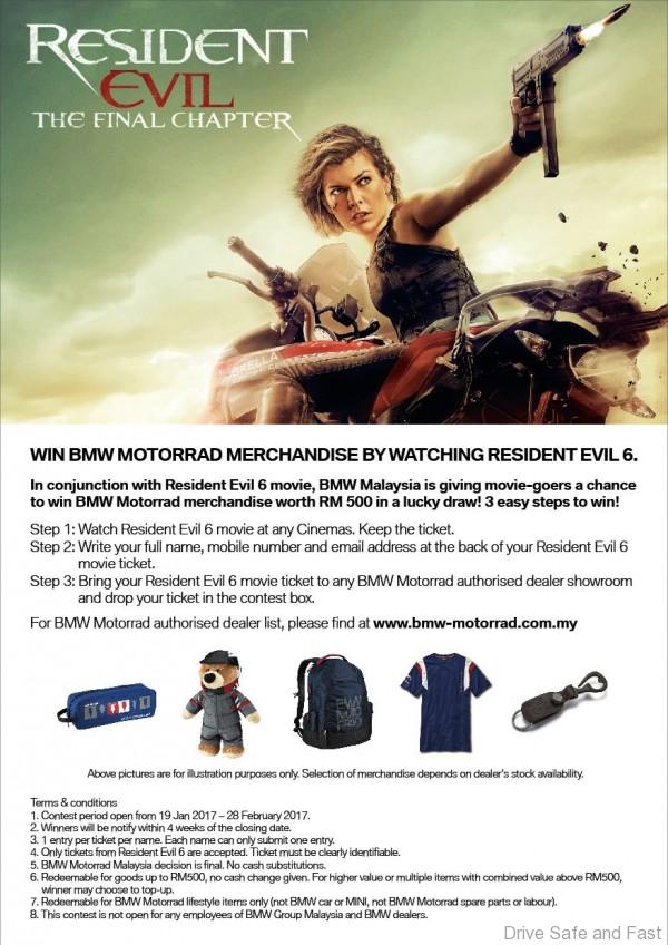 In conjunction with the release of Resident Evil 6: The Final Chapter in cinemas nationwide, BMW Motorrad Malaysia is introducing a lucky draw contest where Malaysian movie-goers stand a chance to win BMW Motorrad merchandises worth up to RM500.