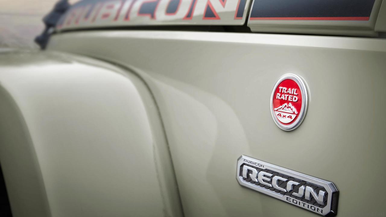 Wrangler Rubicon Recon Edition has many different features that make it distinctive, including a half-inch lift, new 17-inch Low Gloss Granite Crystal-painted aluminum wheels wrapped in 32-inch BF Goodrich KM off-road tires, optional body-color fender flares and a dual-vented Power Dome hood with a black-silhouette “Rubicon” decal on both sides.