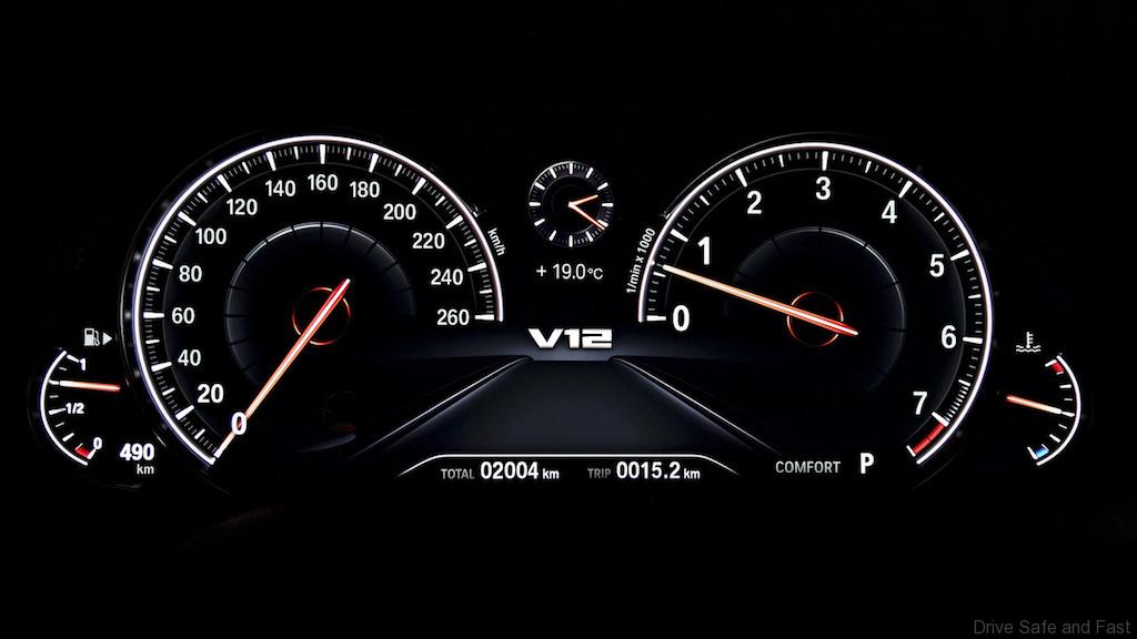 The now familiar BMW M Performance character is also present and correct inside the car. The exclusive M leather steering wheel carries the M logo, has Pearl Gloss Chrome multifunction buttons on its spokes and shift paddles for manual gear changes on the reverse. Door sill plates with an illuminated V12 logo whet the appetite for the driving pleasure to come, while the instrument cluster contains an exclusive speedometer featuring the model designation and a dial now extending to 330 km/h (205 mph).