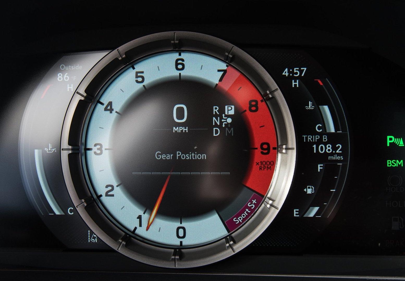 The low instrument panel position, together with the low hood line and narrow A pillars, give the low-seated driver a commanding view of the road. All driving controls are easy to reach without altering one’s posture. Lexus positioned the information displays at the same height, to reduce the degree of eye movement required to read them. The instrument binnacle houses the latest version of the thin film transistor (TFT) display technology introduced in the Lexus LFA supercar, including a moving central ring.