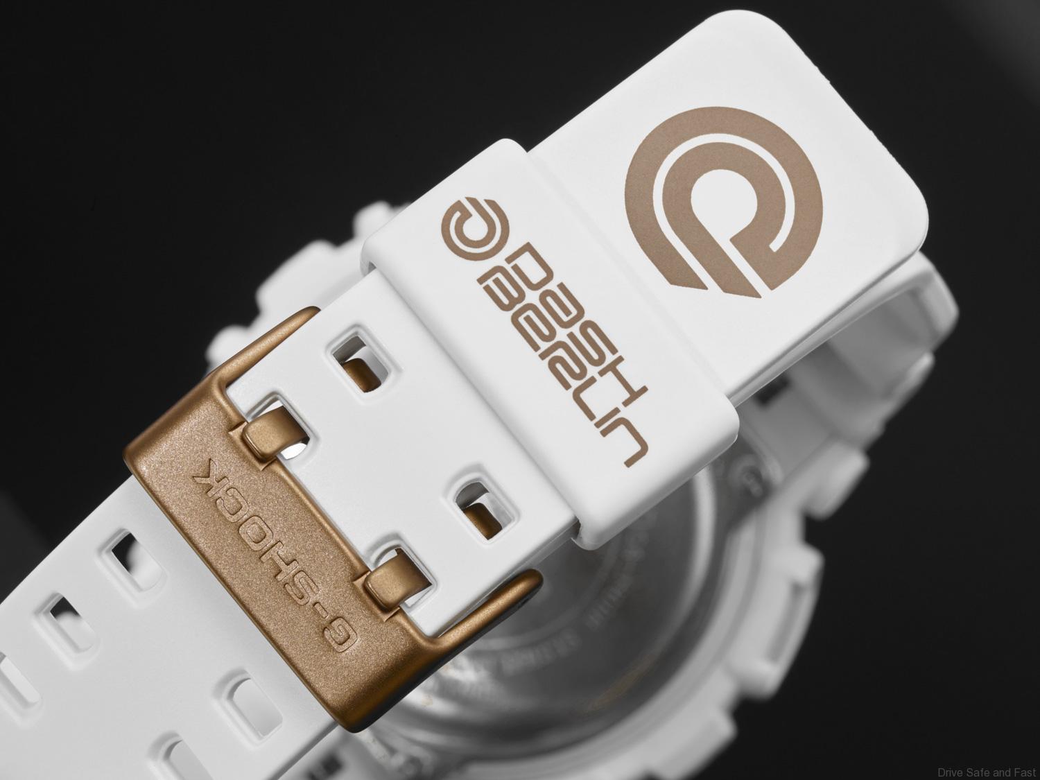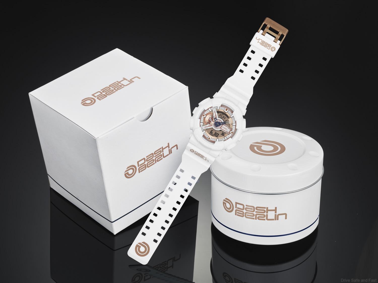 The exclusive Dash Berlin model is a GA-110 G-SHOCK Big Case series, staying true to the concept of absolute toughness and unbreakable durability. It is available in clean and sophisticated white combined with stylish rose gold. Personally designed by Dash, the colour white represents the blank canvas of life waiting to be written upon, stimulating creativity and action, while his choice for gold stands for luxury and quality. This attention grabbing watch spots the official Dash Berlin logo and has the rugged functionality and bulky design that sets the G-SHOCK brand apart.