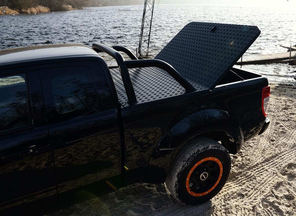 The truck shown here was lifted above the ground by 5 centimeter with a body lift kit – also known as riser kit. An improved engine sound via a sound-booster provides an unmistakable acoustic. The bumpers on both sides are widened by 7,5 cm each and 30 mm spacer discs are mounted to the four axle ends. The dimension of the rims measures 9 x 18 inch with 20 mm offset. Fitted with appropriate tires in 285/60-18 raises the vehicle by another two centimeter. The truck bed cover – also referred to as loading area cover – made of an aluminum checker plate is powder-coated in matte black. Other chrome parts are wrapped in black vinyl or coated in black.