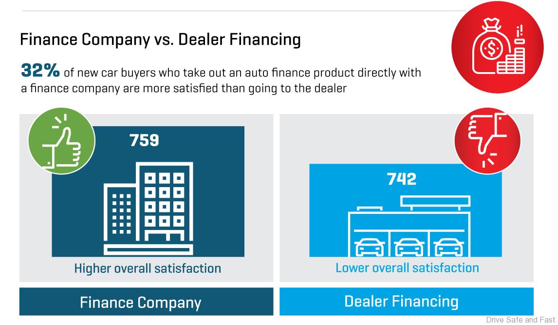 - Finance company vs. dealer financing: Nearly one-third (32%) of new-car buyers who purchase a finance product directly from a finance company are more satisfied than those going through a dealer to arrange financing (759 vs. 742, respectively).