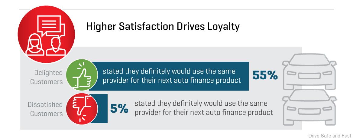 - Higher satisfaction drives loyalty: With a country average of two cars per household, 55% of customers who were delighted with their experience (overall satisfaction scores of 852 or higher) say they “definitely would” use the same provider for their next auto finance product, compared with only 5% of those who were dissatisfied (650 or below).