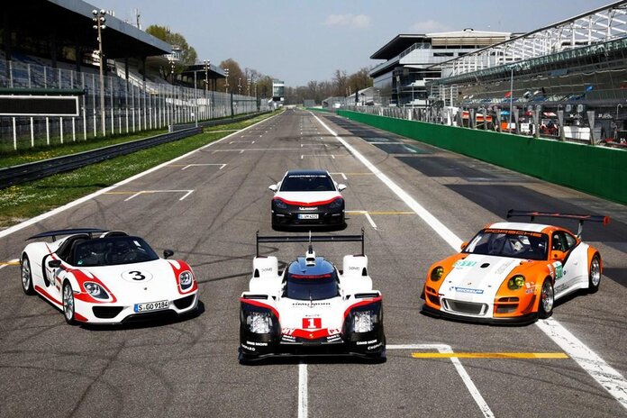 For the presentation of the 919 Hybrid LMP1 racing car at the pre-season test of the FIA World Endurance Championship (WEC) 2017 in Monza, Italy, Porsche gathered its most powerful hybrid models in one place for the first time. The meeting of high-tech sports cars took place on the start and finish line of the renowned race track in the royal park near Milan.