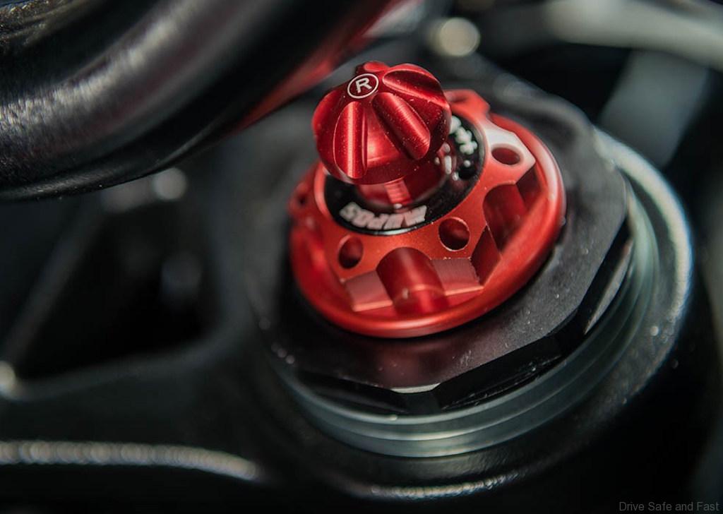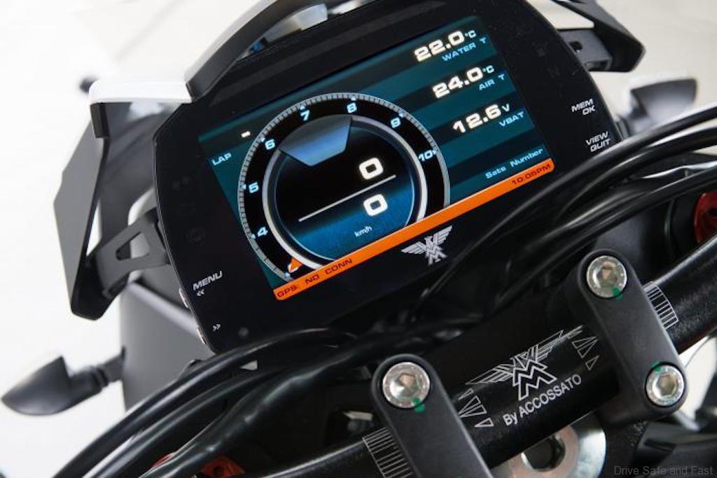 The braking system with switchable ABS relies on four-piston monoblock radial mount callipers, a double floating disc with 320 mm diameter and a 16/19 semiradial pump, all designed by Brembo; while the rear braking system uses a specifically designed two piston calliper with 220 mm disc. Last but not least, the dual-compound Pirelli Diablo Rosso III tyres provide maximum grip even during braking.