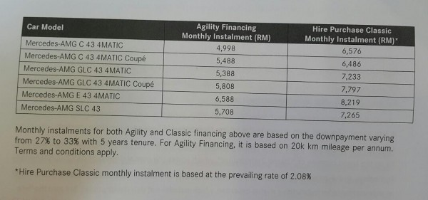 Here are all the stats and prices you could ask for. Please note that some of these vehicles have different power outputs and the SLC model lacks 4MATIC. A table at the end of the post will give you a rough idea on the Agility Financing options available.
