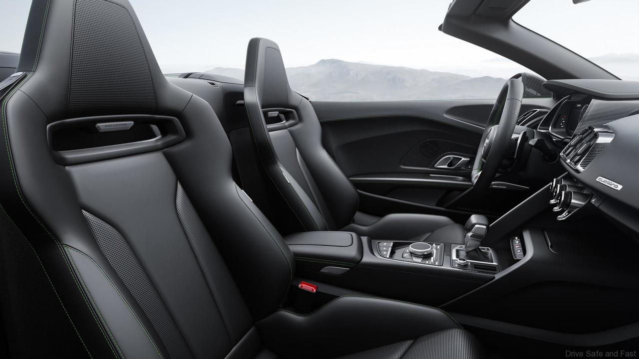 The optional micrommata green design package lends the convertible high-performance sports car the ultimate edge. Its body is painted in a distinctive green. The anthracite gray Singleframe grille and black tailpipe covers create a sharp contrast. Audi exclusive furnishes the interior completely in black, in fine Nappa leather, which is perforated on control elements. Green contrast stitching accents the seats, center armrests, doors and floor mats with luminous color that matches the exterior.