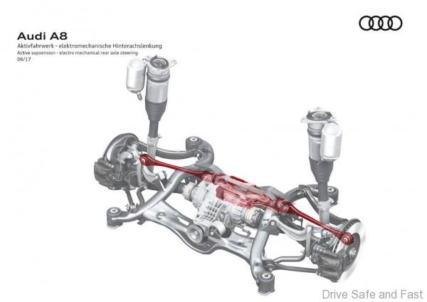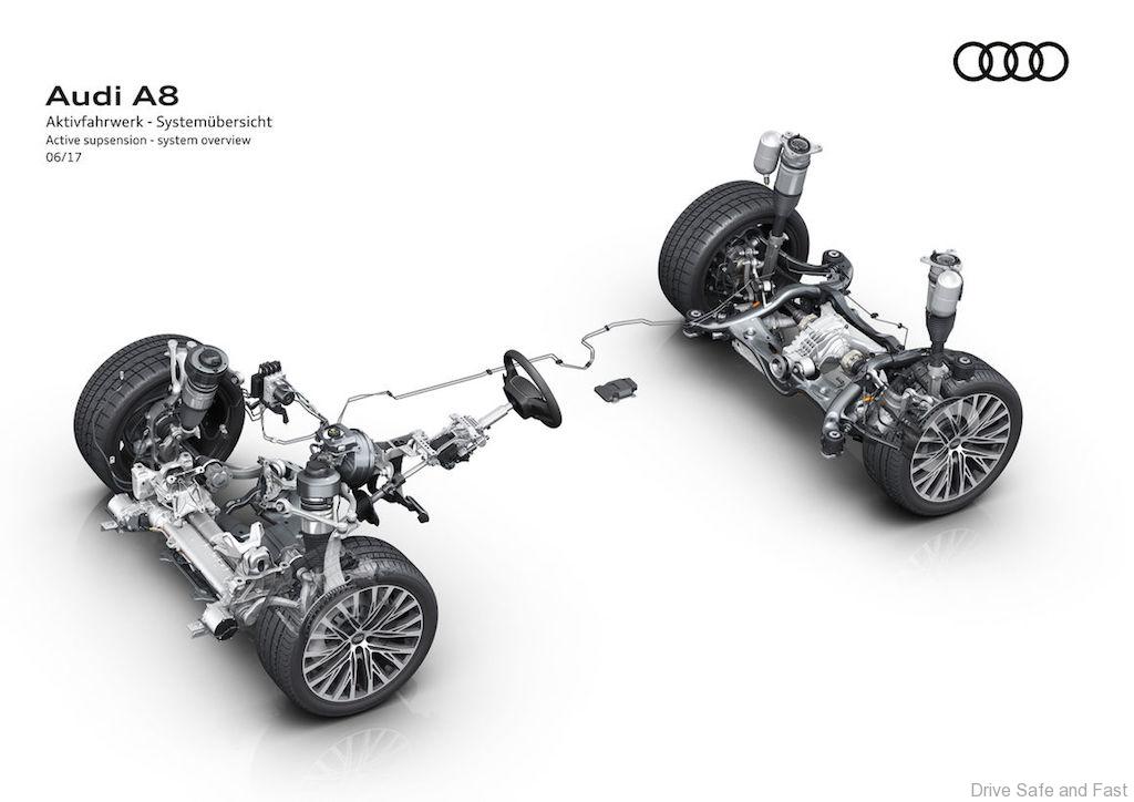 The all-new active suspension on the Audi A8 is a fully active, electromechanical suspension system, which drives each wheel individually and adapts to the prevailing road conditions. Each wheel has an electric motor which is powered by the 48-volt main electrical system. Additional components include gears, a rotary tube together with internal titanium torsion bar and a lever which exerts up to 1,100 Nm on the suspension via a coupling rod.