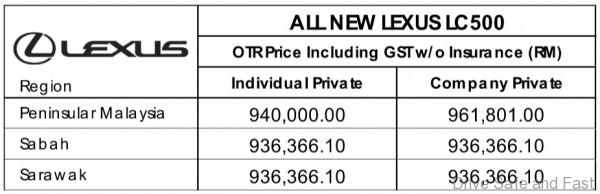 Below is the summary of the confirmed On-The-Road price without insurance for the all-new Lexus LC500.