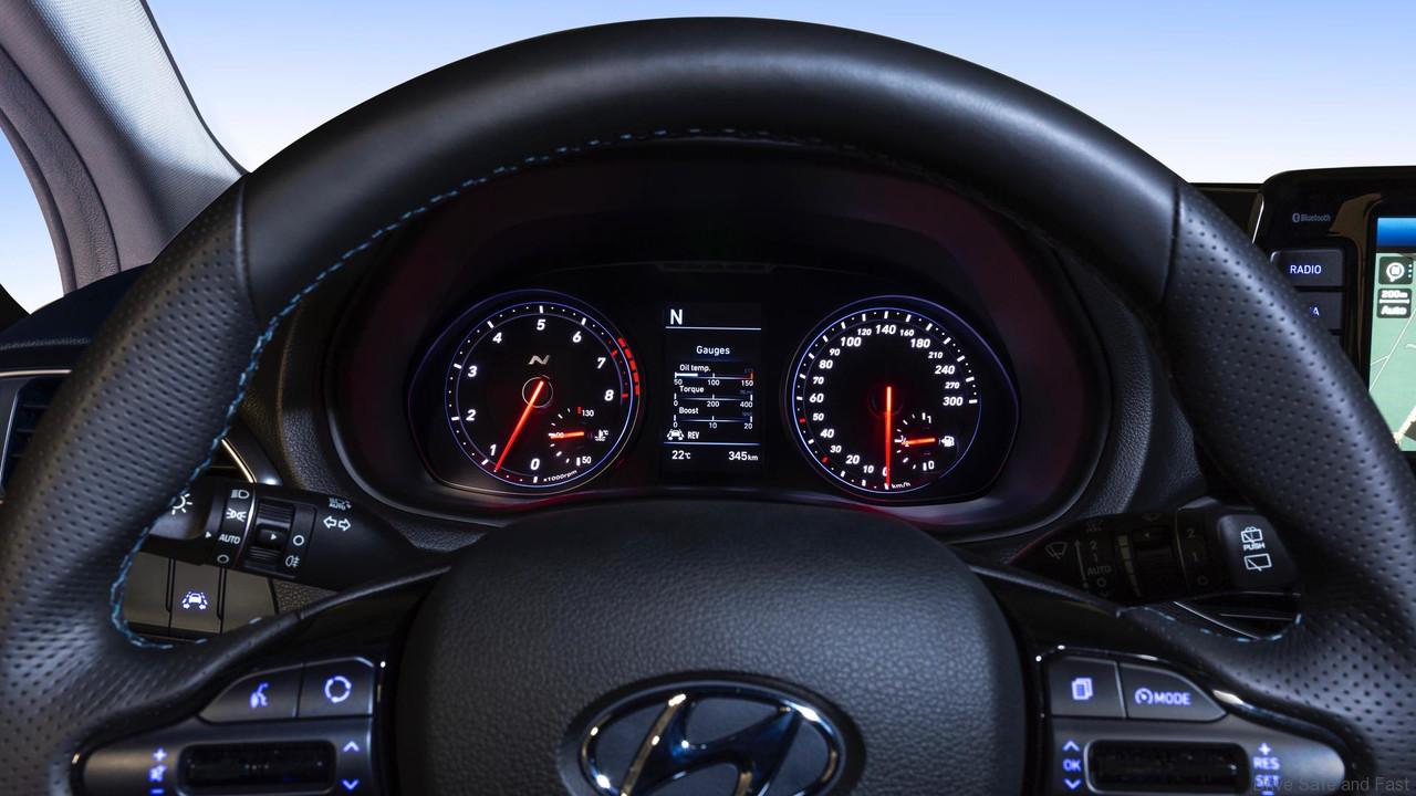 The electronic instrument cluster is specifically made for passionate drivers. The shift timing indicator positioned at the top centre of the cluster indicates when to shift gears for optimal race track driving performance. The red zone of the variable LED rev-counter changes according to the driving performance and varies with the engine’s oil temperature. Both the rev-counter and the speedometer are distinctively designed in accordance with the N line up, being surrounded by a blue lightning line.