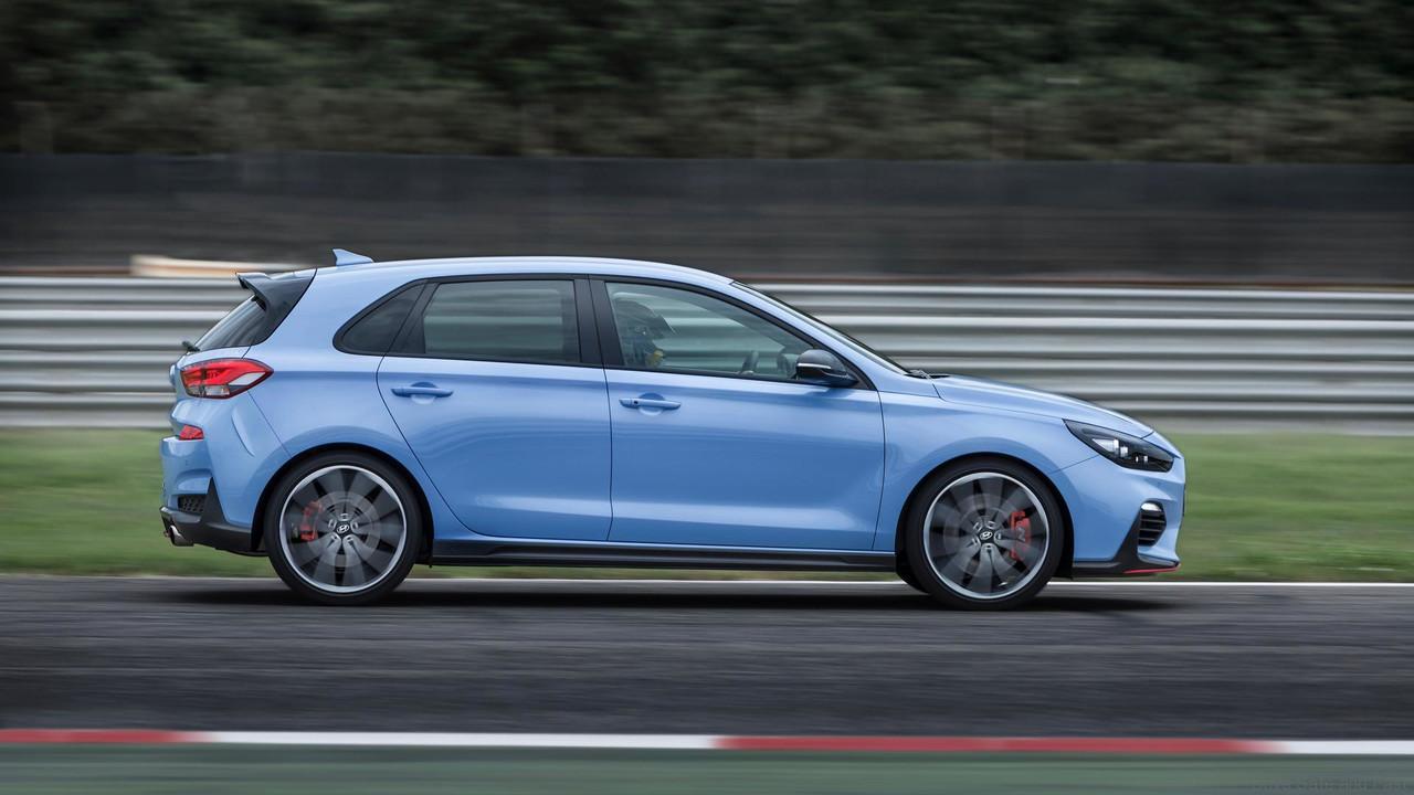 True performance design: aggressive front and rear bumpers with larger air intakes and red character line, aerodynamic rear spoiler with triangular brake light, dual muffler exhaust, 18- and 19-inch wheels, sport seats, Performance Blue exterior colour inspired by Hyundai Motorsport.