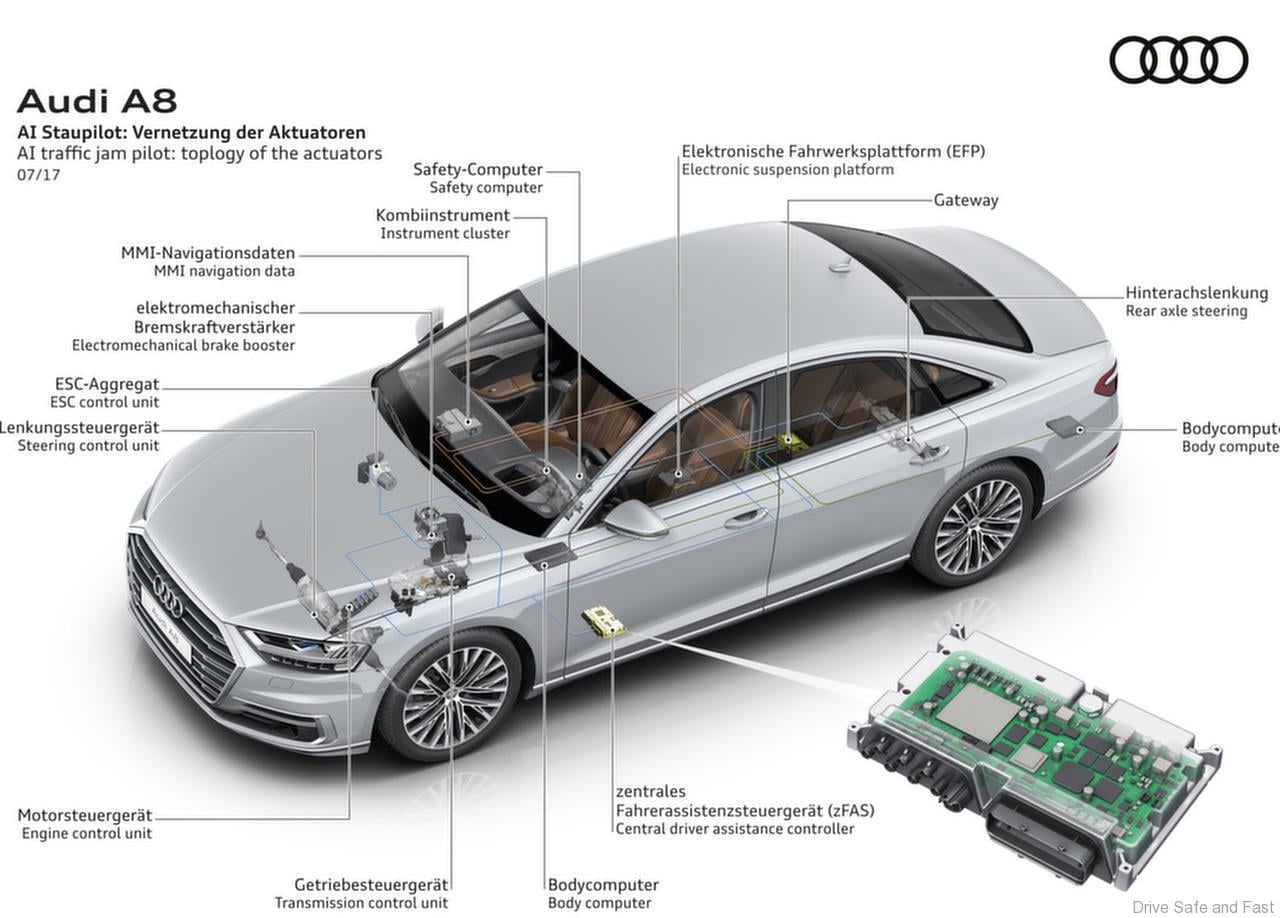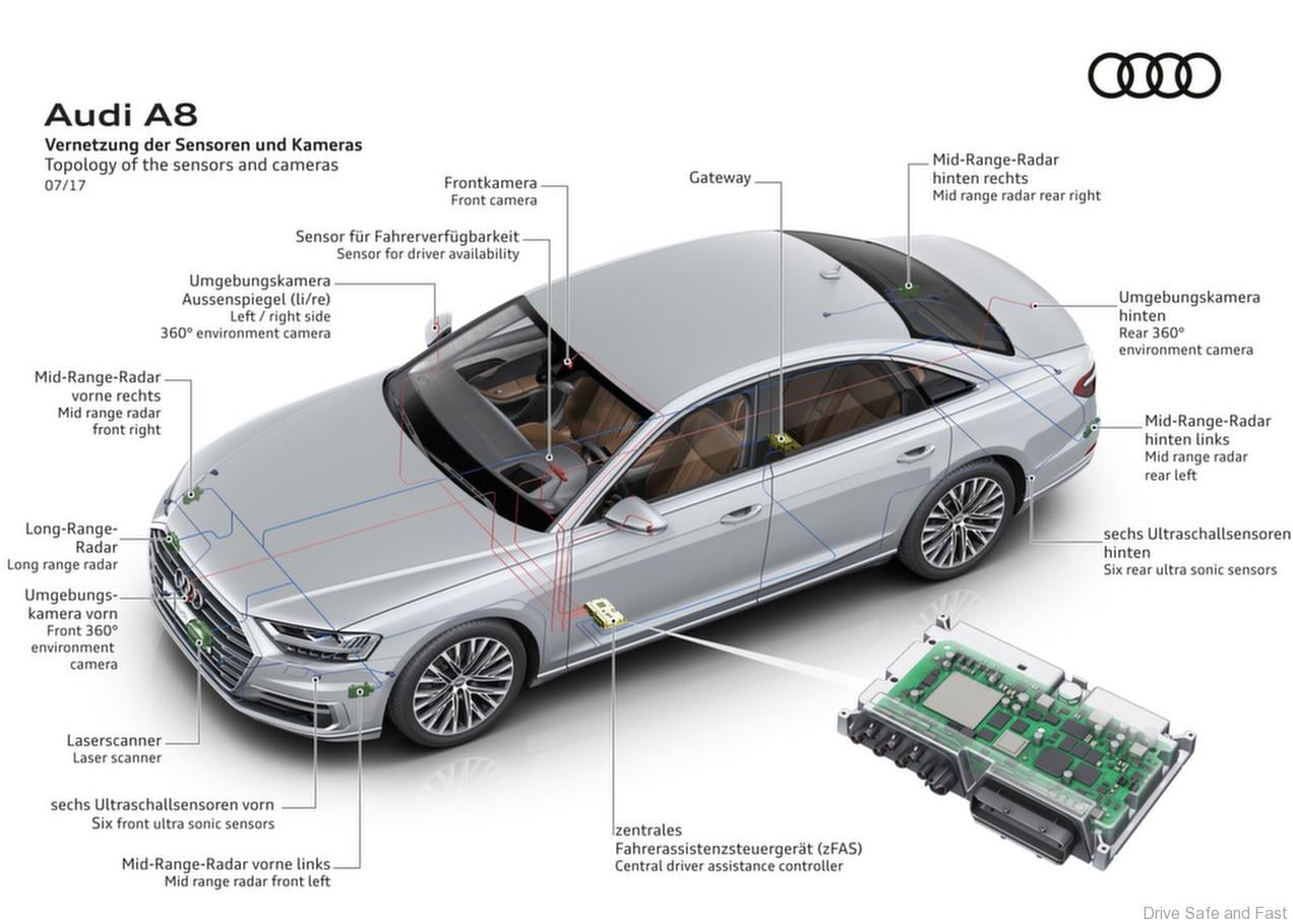 Audi said that with its forthcoming Traffic Jam Pilot, the A8 will be the first production car with Level 3 autonomy. That means under specific conditions those A8s can be put in autopilot, allowing the driver to take his eyes off the road.