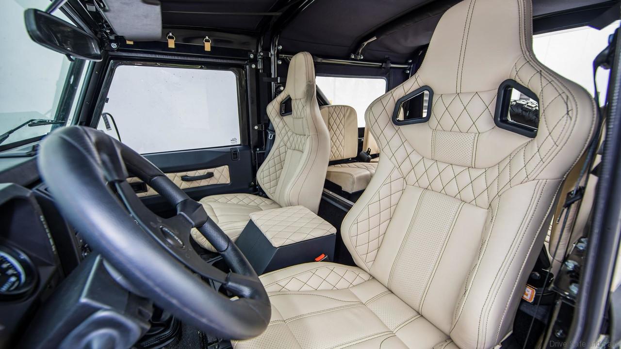 This Defender cabin now boasts a full roll cage, Momo steering wheel, and Corbeau seats wrapped around in ivory leather adorned with black stitching. In charge of providing the entertainment is a Kenwood infotainment system linked to a JBL sound system packing a subwoofer for that extra bass.