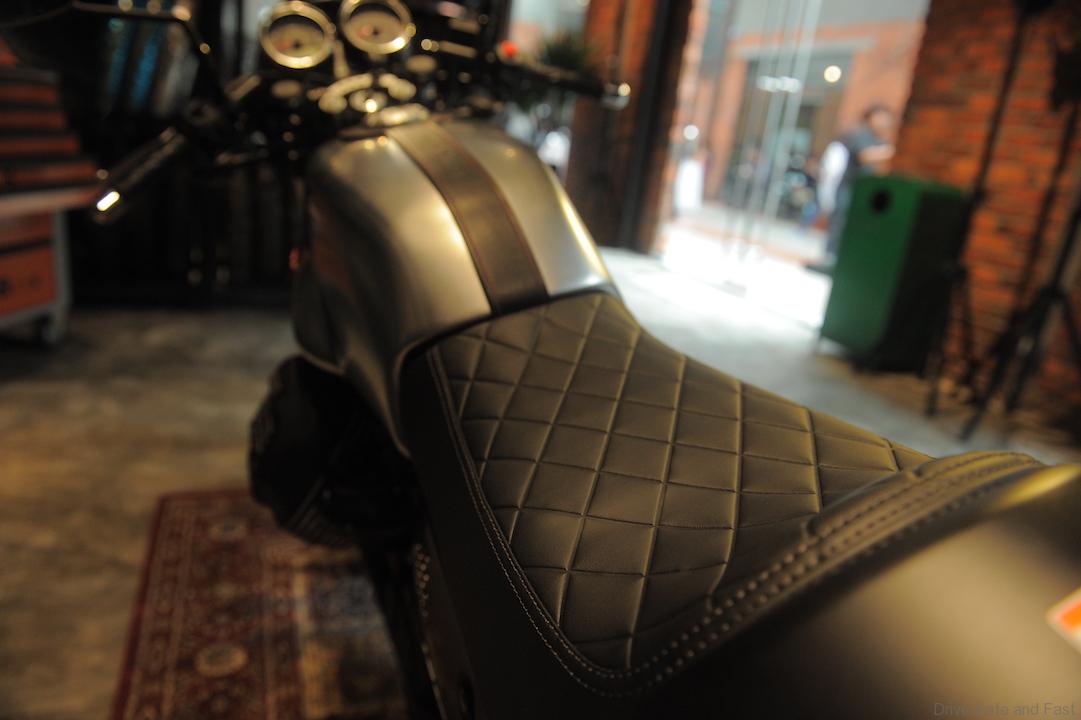 Headlight cover: made from laser cut aluminium and painted black, shaped to follow the muscular lines of the V9 Bobber, this provides greater protection from the wind and gives the vehicle a more aggressive look.