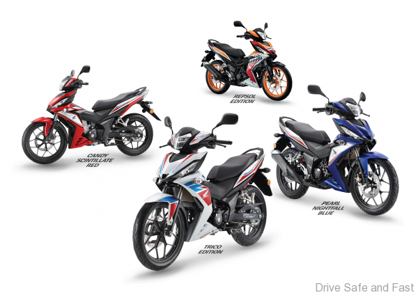 The new RS150R will be available in three new colors: Pearl Metalloid White (Trico), Candy Scintillate Red and Pearl Nightfall Blue, as well as the existing Repsol type. It will be available in Honda dealer showrooms from 7th August 2017 and they are priced at RM 8,478.94 (Candy Scintillate Red and Pearl Nightfall Blue) and RM 8,796.94 (Trico and Repsol). Prices include GST but exclude road tax, insurance and registration. The model comes with two years or 20,000km manufacturing warranty (whichever comes first).
