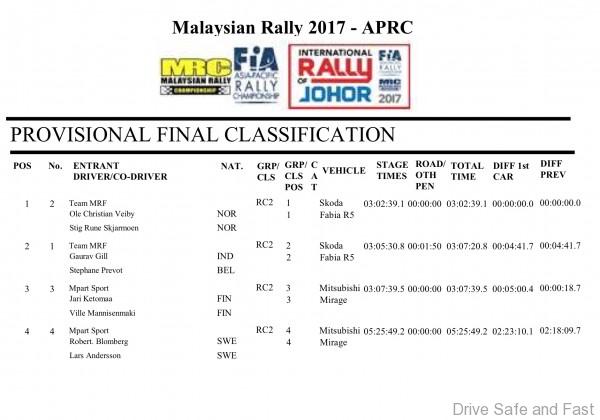 On his first attempt rallying in the Far East and his first rally after the massive crash in Finland 2 weeks ago, Ole defeated the odds to comfortably win the rally by 4 minits ahead of teammate Gaurav Gill. With the win Ole further extends to his lead in the championship points table.