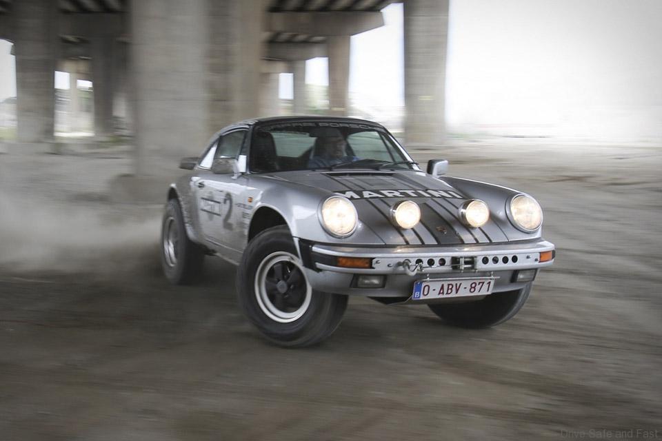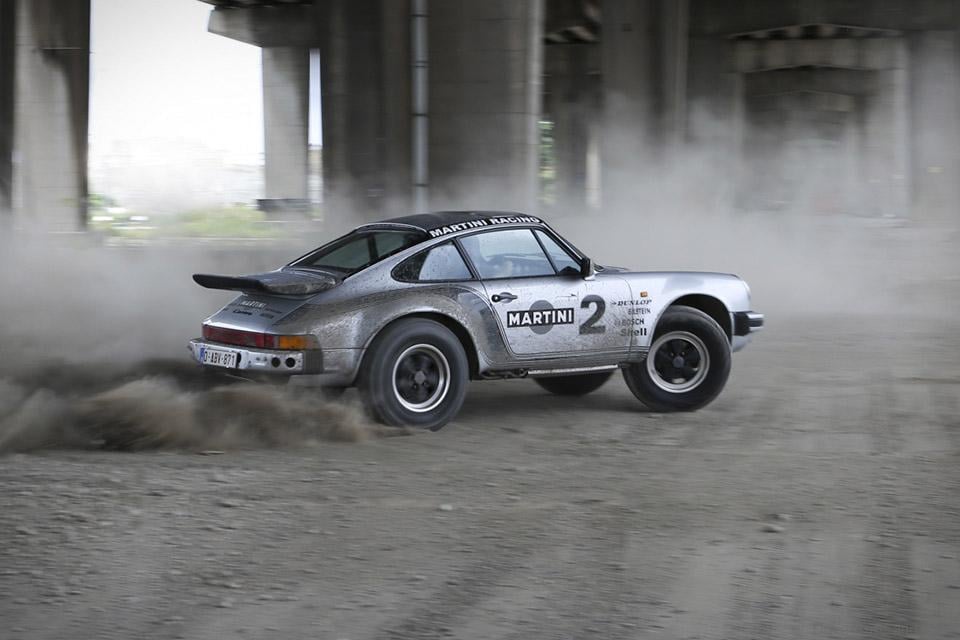 Modifications include a beefed up suspension with Bilstein B6 Sport dampers, mudder tires mounted on 16-inch rims, stainless steel skid plates to protect the undercarriage, and a winch hidden in the custom front bumper. It develops nearly 230bhp from its 3.2L flat-six engine, plenty enough to make the monochrome Martini Racing livery a little blurry as you go sliding past.