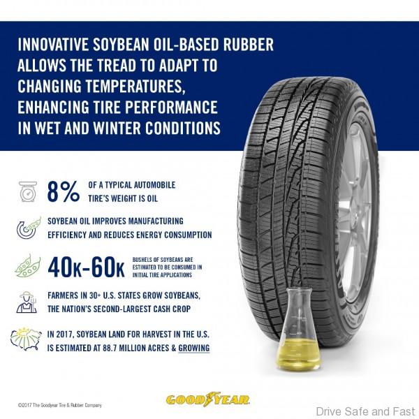 By employing soybean oil in tyres, Goodyear found a new way to help keep the rubber compound pliable in changing temperatures, a key performance achievement in maintaining and enhancing the vehicle’s grip on the road surface.