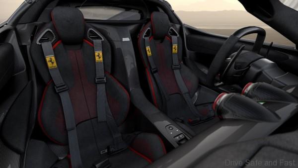 For the auction Ferrari has designed a one-of-a-kind livery in stunning metallic Rosso Fuoco and featuring a metallic Bianco Italia double racing stripe on the bonnet and rear. The interiors have been conceived in black Alcantara and shiny black carbon fiber with red leather inserts on the seats and red stitching.