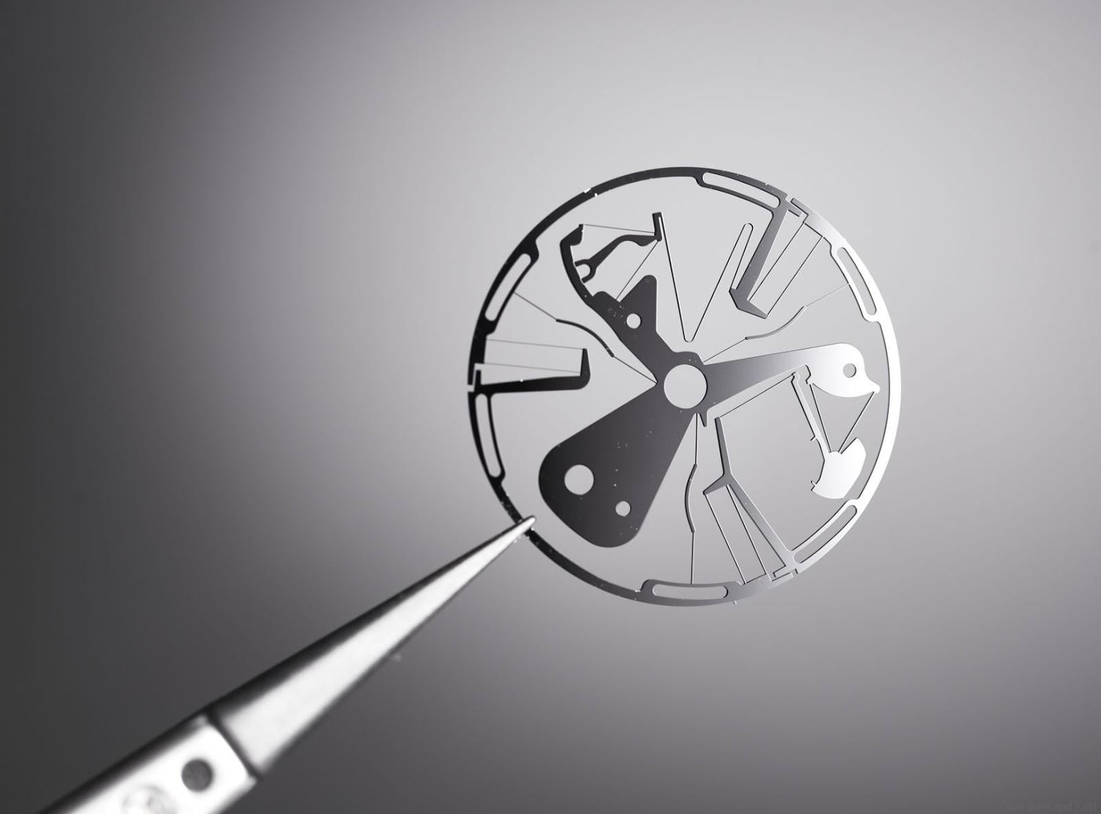 A new oscillator forming a monolithic whole, made of mono-crystalline silicon (with details finer than a human hair), replaces the sprung balance. The 30 or so components of a standard regulating organ (which requires assembly, adjustment, timing, testing and lubrication) are thus replaced by a single element measuring just 0.5 mm thick (compared with the usual 5 mm.)