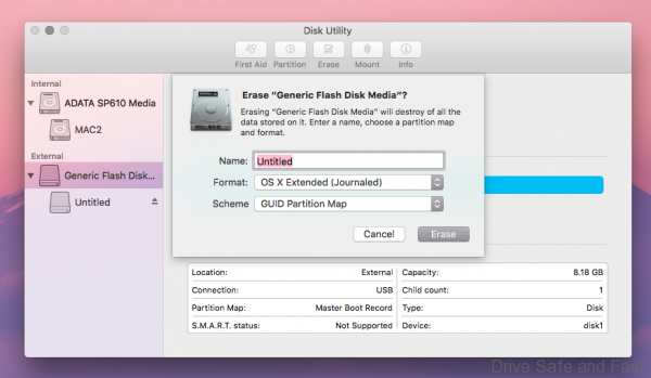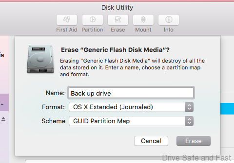 Step Five: Rename the disk (or leave it as it is). but more importantly set the ‘Format’ and ‘Scheme’ to the following: