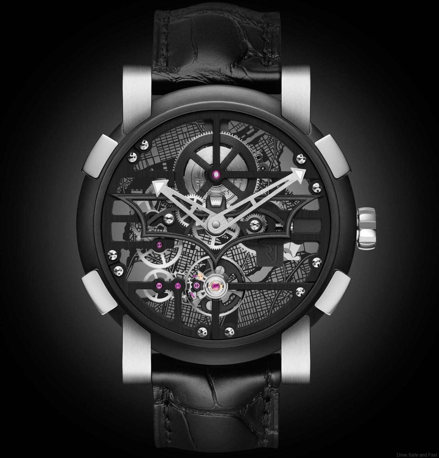 Available in the brand’s distinguishable Skylab model, transparency dominates the timepiece. The 48 mm case features a Swiss Made manual winding movement designed by RJ and characterized by straight lines and chamfered angles.