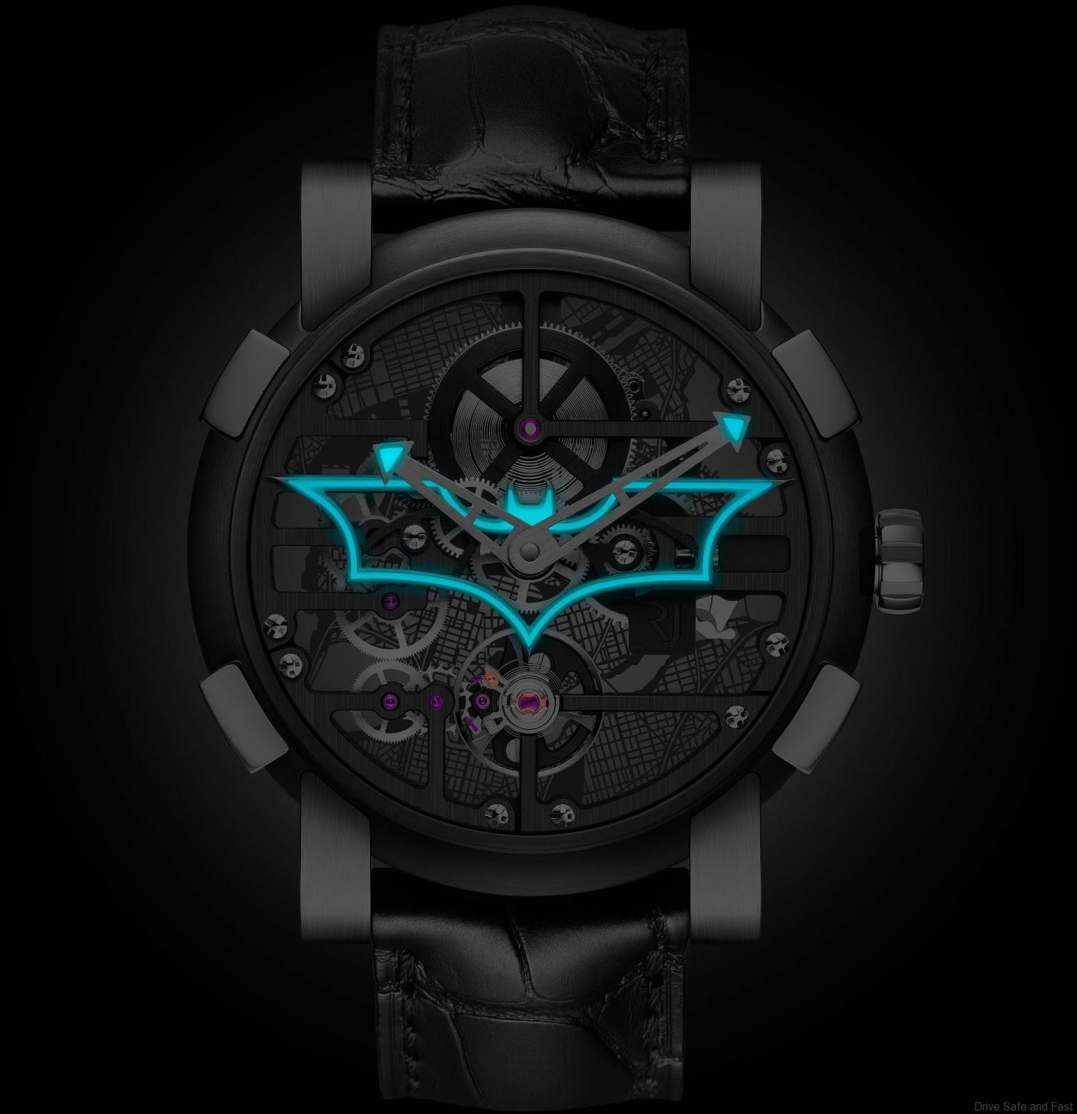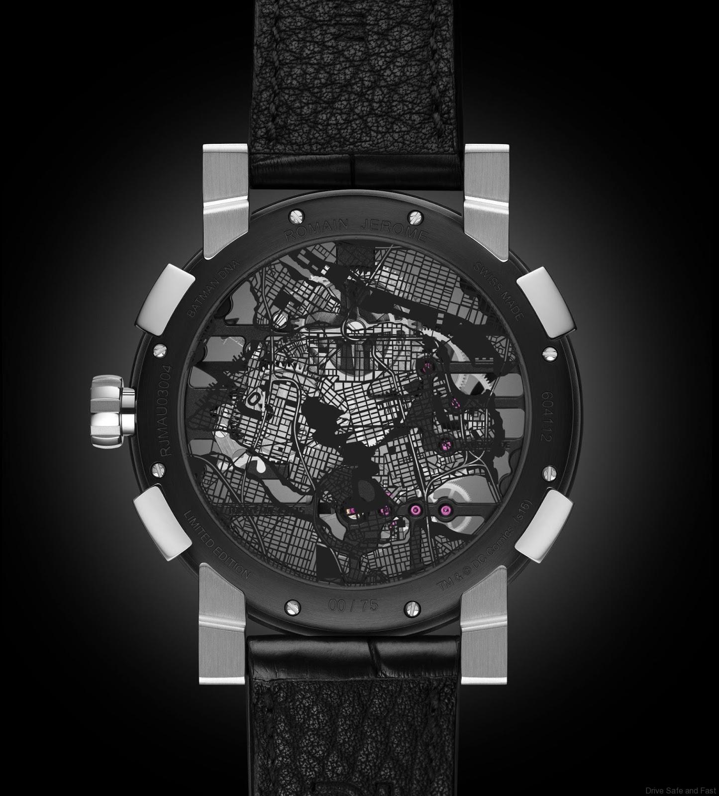 This functional applique, acting as the motion-work, recalls both the sheerness and sophistication of the skeleton movement. But the subtlety of the Skylab Batman timepiece does not lie within the stealth and central logo, indeed the map of Gotham City has been metallized onto the back sapphire crystal glass. Looking into the dial, Batman seems to be overlooking Gotham City and when darkness comes, the bat signal shines blue to echo the previous Batman models as well as “The Dark Knight” trilogy aesthetics.