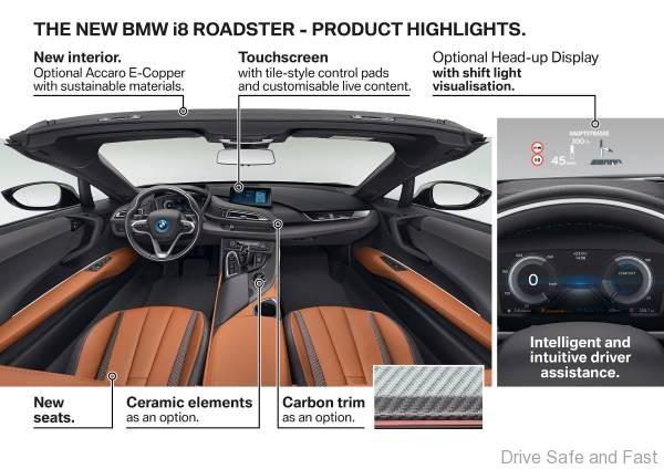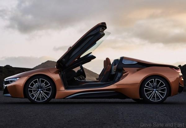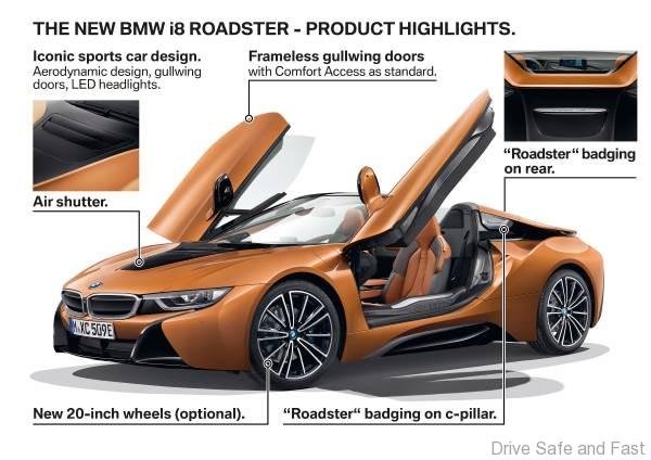 Unique LifeDrive vehicle architecture and BMW i form language carried over into a captivating roadster concept. Model-specific body strengthening elements and gullwing doors feature the signature lightweight construction of BMW i models; windscreen frame also made from carbon-fibre-reinforced plastic (CFRP). Inherent weight penalty of the new BMW i8 Roadster over the new BMW i8 Coupe limited to approximately 60 kilograms.
